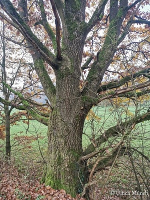 Alle großen Eichen auf der Südwestseite bleiben als Überhälter erhalten, auch einige ältere und nach Ansicht der UNB wertvolle/ältere Gehölze werden stehen bleiben