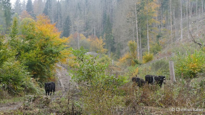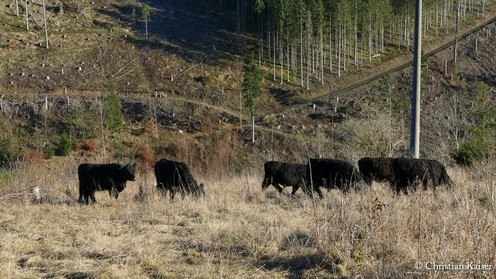 Im Tiefenbachtal östlich von Steinberg in der Gemeinde Wilhelmsthal haben wir 2024 eine neue Naturweide eingerichtet. Ziel ist, im Frankenwald auf den ehemaligen Fichtenflächen, erstmals eine halboffene Landschaft zu entwickeln.